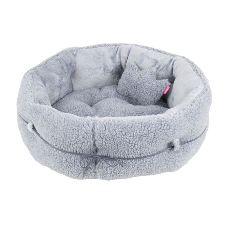 Ce lit pour chat coloris gris est 100% polyester. Il est vendu avec une peluche en forme de couronne.