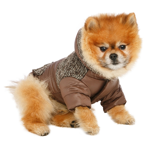 Ce manteau à capuche est très chic avec ses empiècements en tweed marron et ses deux poches décoratives. Il est doublé en polaire marron pour les toutous frileux, se ferme à l’aide de boutons pression, et dispose de manches.